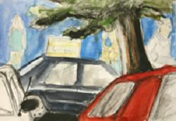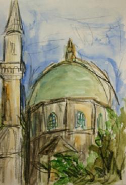 das kleine Kännchen, auf einem silbrig-glänzenden Tablett. Stellt es auf das kleine Bänkchen vor dem Laden. Der Alte blinzelt, träumt. Sein blaues Hemd mit den weißen Streifen, dunkelbraun-graue Hosen, schwarze Sandalen. Mein Stift setzt langsam an, dringt in seine Gesichtszüge, Falten, kleine, sonnengeblendete Augen, ein schmaler Mund. Sein linkes Bein ist elegant über das rechte gefaltet, schelmisch lugt eine Socke hervor. Weiter wandert mein Stift, sieht die Regenrinne, die sich leise an das Fenter im Hintergrund schmiegt. Im Vordergrund Steine, grob geflastert. In der rechten Hand ruht die Zigarette, gelegentlich zum Mund geführt, zwischen Kaffee und Stille. Mein Stift wird stumpf; das Bild ist keine Wahrheit, ein Augenblick. Leicht füge ich noch Flächen mit Aquarellfarben zusammen: sienna, grau, olivefarben, ein wenig beige. Der Hintergrund verliert sich in einem Elfenbeinschwarz und hebt den Alten heraus. Zehn Minuten später: er steht auf. Geht langsam seines Weges. Aber mein Augenblick dauert noch ein bißchen an.